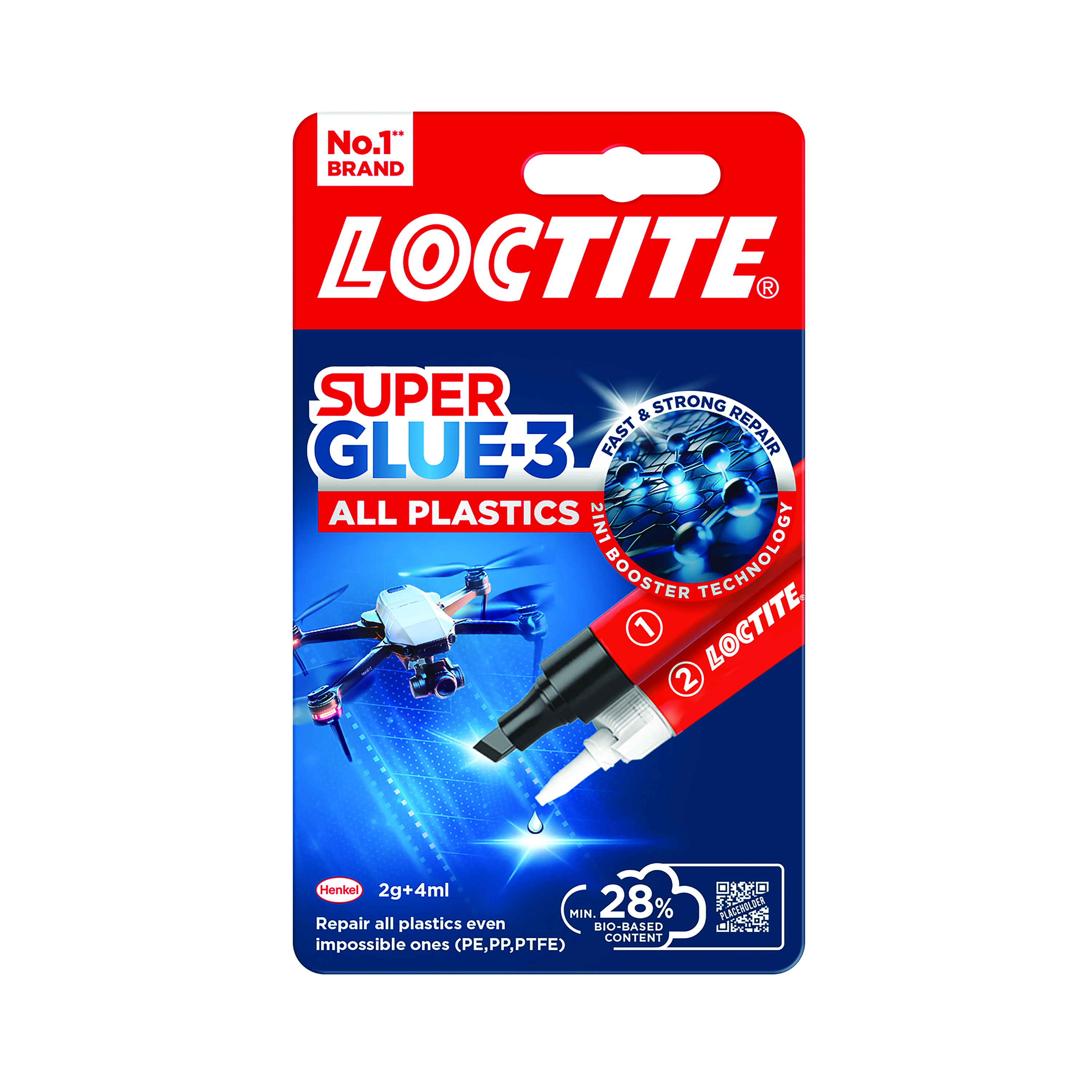 Loctite All Plastics Super Glue contains cyanoacrylate and has been specially designed to glue all types of plastic, including the most difficult plastics such as polyethylene (PE) and polypropylene (PP). It also glues metal, leather, wood and even rubber. The glue remains transparent even after drying.