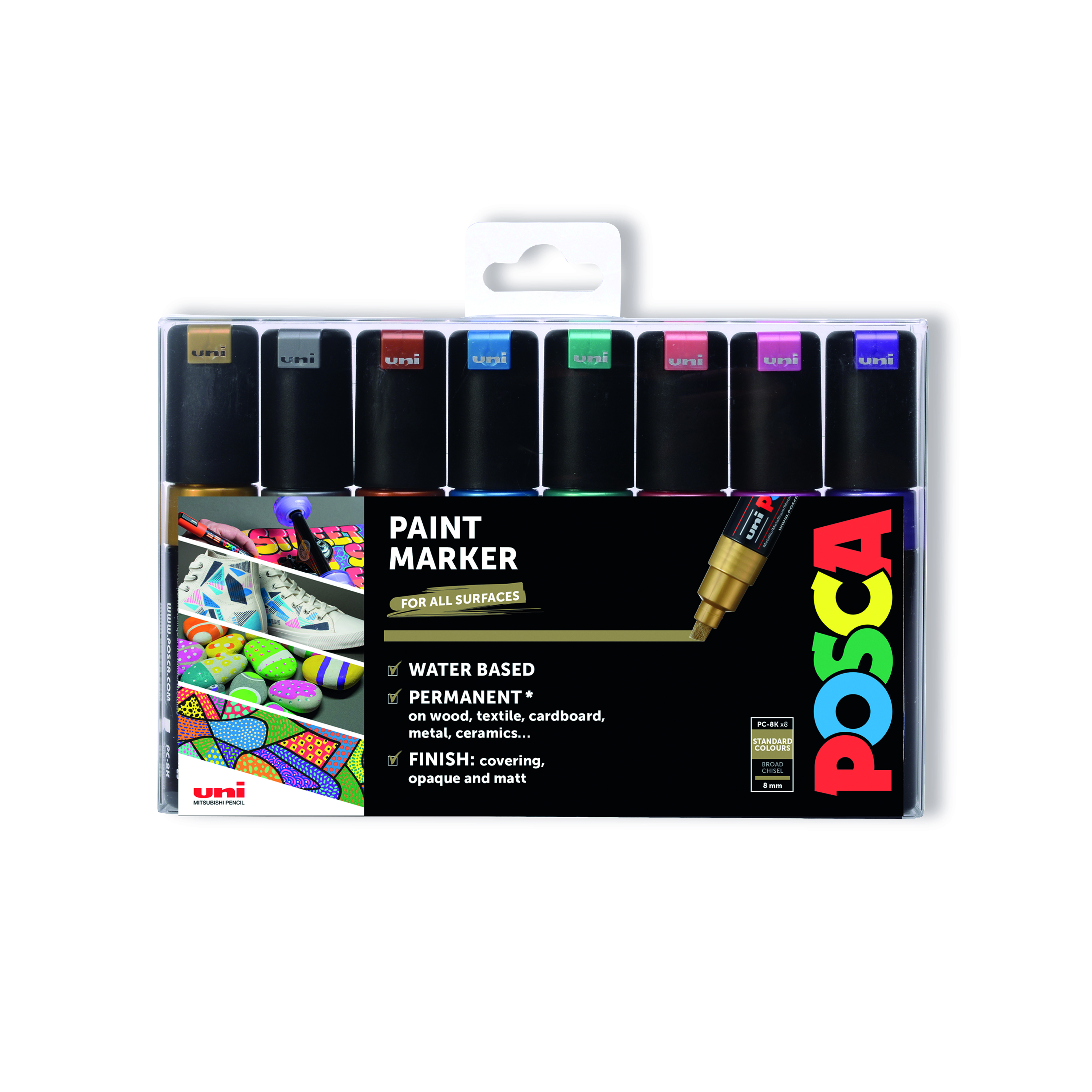 POSCA paint markers are excellent multi-surface, creative pens. The uni POSCA paint marker contains water-based pigment ink which is lightfast, water-resistant and will write on almost any surface. The POSCA markers are permanent markers on paper, card and wood and can be made permanent on various other surfaces including terracotta, porcelain, glass, textiles, metal, plastic and wood. These multi-use marker pens are available in a number of vibrant, opaque solid colours which can be mixed while the paint is wet and overlay colours on top of one another when they dry. Excellent for customisation, up-cycling, illustration, posters, fine art or sign-writing. Supplied in a pack of 8 pens in assorted colours.